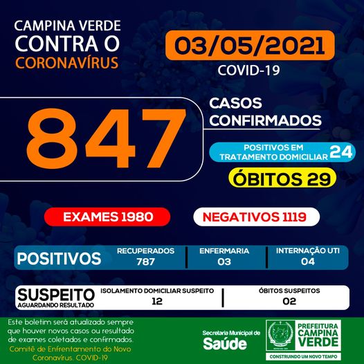 A Prefeitura de Campina Verde através da Secretaria de Saúde divulgaram nesta segunda-feira 03, os novos dados do boletim epidemiológico. Até o momento já foram realizados 1980 exames, sendo eles, testes “Swab” e testes rápidos.