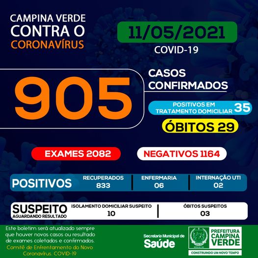 A Prefeitura de Campina Verde através da Secretaria de Saúde divulgaram nesta terça-feira 11, os novos dados do boletim epidemiológico. Até o momento já foram realizados 2082 exames, sendo eles, testes “Swab” e testes rápidos.