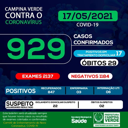 A Prefeitura de Campina Verde através da Secretaria de Saúde divulgaram nesta segunda-feira 17, os novos dados do boletim epidemiológico. Até o momento já foram realizados 2137 exames, sendo eles, testes “Swab” e testes rápidos.