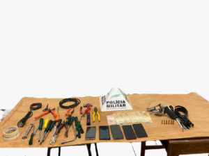 Durante as buscas , os militares, localizaram, no interior do veículo, um révolver, calibre .38, carregado com seis munições e diversas ferramentas, comumente, utilizada para arrombamentos e, diversas abraçadeiras, conhecidas por “enforca gato”, normalmente utilizadas, por assaltantes, como algemas para aprisionar as vítimas.