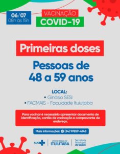 Nesta terça-feira (6), a vacinação contra a Covid-19 será em quatro pontos de Ituiutaba. No Ginásio do Sesi, com entrada pela Rua Sibipiruna, entre as Ruas Canela e Jatobá, no Bairro Alvorada, poderão comparecer pessoas entre 48 e 59 anos para o recebimento das primeiras doses. Integrantes desse grupo geral também poderão comparecer na FacMais, no Universitário, onde além de pessoas entre 48 e 59 anos, também serão recebidos trabalhadores da indústria entre 45 e 59 anos.