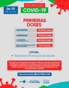 Gestantes, puérperas (até 45 dias após o parto), lactantes (com crianças de até 6 meses) acima de 18 anos e profissionais de educação poderão comparecer na sede da Secretaria Municipal de Saúde, situada na Avenida Sete, n° 1039, no Centro, também das 8h às 15h.