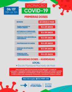 Na Escola Municipal Machado de Assis – EMMA, no Setor Sul, das 8h às 15h, poderão comparecer trabalhadores da limpeza urbana, idosos que ainda não foram vacinados, pessoas integrantes dos grupos prioritários entre 18 e 59 anos de idade sendo as com comorbidades, pessoas com deficiência permanente, profissionais de saúde, motoristas e cobradores do transporte coletivo rodoviário de passageiros urbano e de longo curso (entre 18 e 59 anos de idade) e agendados para segundas doses.