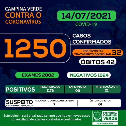 A Prefeitura de Campina Verde através da Secretaria de Saúde divulgou nesta quarta-feira 14, os novos dados do boletim epidemiológico, que apontam até o momento 2882 exames já realizados. Desse total 1250 pessoas atestaram resultado positivo para Covid-19, e outras 1624 pessoas atestaram resultado negativo da doença. Já foi registrado pelo município 42 óbitos confirmados pela doença, e existe 01 óbito suspeitos da Covid-19.
