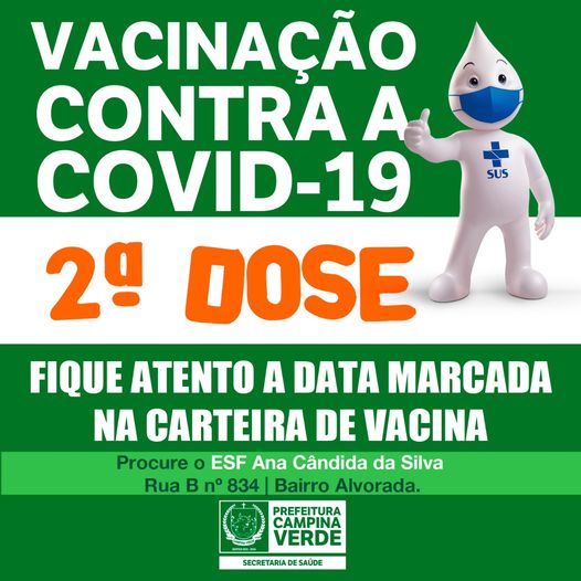 A Prefeitura de Campina Verde através da Secretaria Municipal de Saúde está realizando a vacinação da 2ª dose contra Covid-19. A vacinação acontece na unidade de saúde ESF Ana Cândida da Silva na Rua B, no Bairro Alvorada das 08h às 15h.