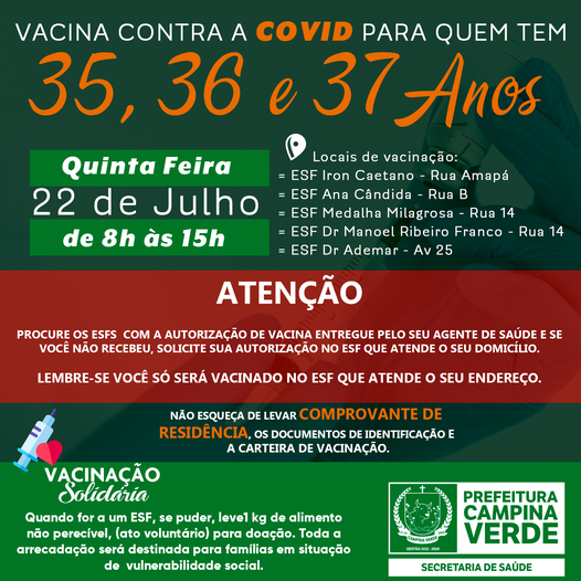 A Prefeitura de Campina Verde através da Secretaria Municipal de Saúde estará realizando nesta quinta-feira 22, a vacinação contra Covid-19 para o público de 35 a 37 anos que não fazem parte das pessoas com comorbidades.