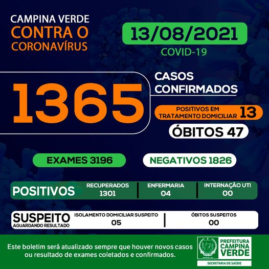 A Prefeitura de Campina Verde por meio da Secretaria de Saúde divulgou nesta sexta-feira 13, os novos dados do boletim epidemiológico, que apontam até o momento 3196 exames já realizados. Desse total 1365 pessoas atestaram resultado positivo para Covid-19, e outras 1826 pessoas atestaram resultado negativo da doença. Já foi registrado pelo município 47 óbitos confirmados pela doença.