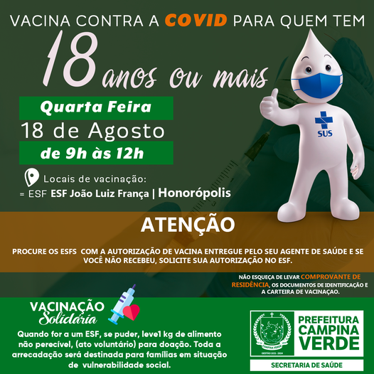 A Prefeitura de Campina Verde através da Secretaria Municipal de Saúde informa que estará realizando nesta quarta-feira 18, a vacinação contra Covid-19 para o público de 18 anos acima do distrito de Honorópolis e que não fazem parte das pessoas com comorbidades.
