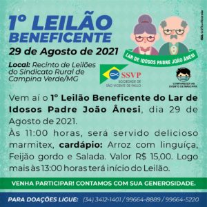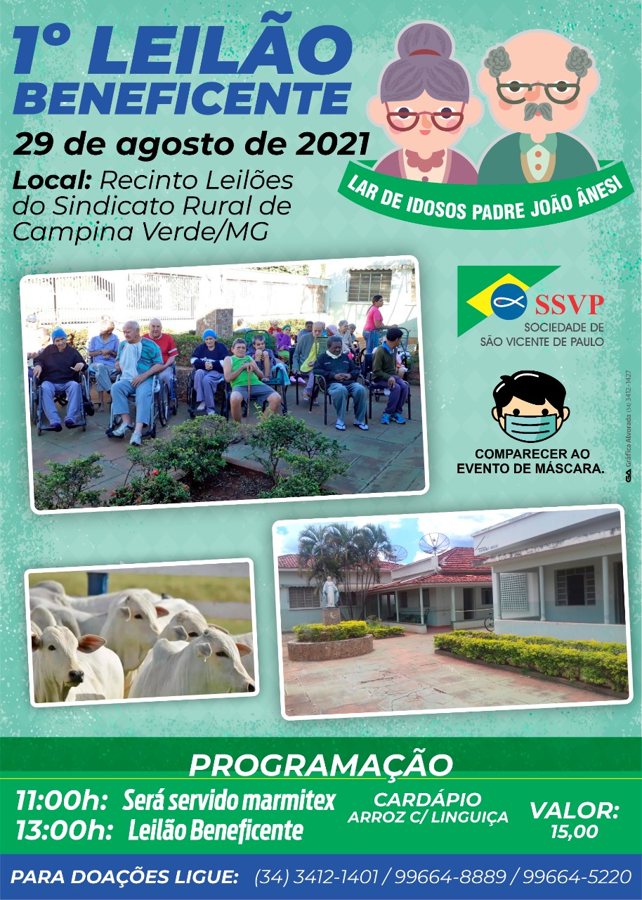 Vem aí o 1º Leilão Beneficente em prol ao Lar dos Idosos Padre João Ânesi, que acontece neste domingo dia 29 de agosto às 13h no recinto de leilões do Sindicato Rural de Campina Verde.