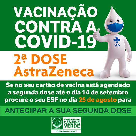 A Prefeitura de Campina Verde através da Secretaria Municipal de Saúde informa as pessoas que tomaram a 1ª dose da vacina AstraZeneca contra Covid-19, que a 2ª dose da vacina vai estar disponível a partir desta quarta-feira 25, em todas as unidades de saúde de Campina Verde bem como do distrito de Honoróplis.