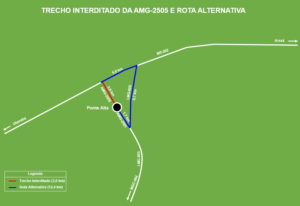 Durante a interdição da AMG-2505, os usuários devem fazer um desvio por cinco quilômetros da BR-262, até chegar ao entroncamento com a LMG-805, de onde seguirão por cerca de mais seis quilômetros até o entroncamento com a AMG-2501. De lá, ainda será preciso seguir no sentido do distrito de Ponte Alta. O desvio tem uma extensão total de 12 quilômetros.