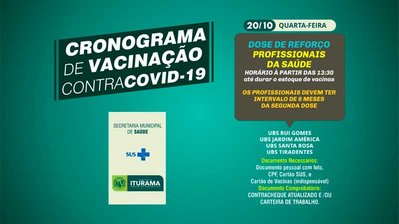 Nesta terça-feira (19), a prefeitura de Iturama comunicou que a vacinação com doses de reforço contra Covid-19 de profissionais da saúde será nesta quarta-feira (20) a partir das 13h30min.