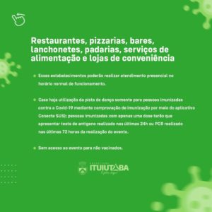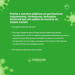 Em caso de que a organização das festas e eventos opte pela utilização da pista de dança, somente poderão participar pessoas imunizadas contra a Covid-19 com duas doses ou dose única, mediante comprovação de imunização por meio do aplicativo Conecte SUS; pessoas imunizadas com apenas uma dose terão que apresentar teste de antígeno realizado nas últimas 24h ou PCR realizado nas últimas 72 horas da realização do evento.