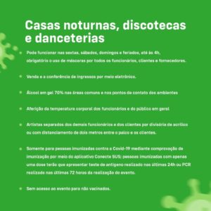 Caso a direção do estabelecimento queira promover shows com a utilização da pista de dança, somente poderão participar do evento pessoas imunizadas contra a Covid-19, mediante comprovação de imunização com duas doses ou dose única por meio do aplicativo Conecte SUS (clique aqui e saiba mais); pessoas vacinadas com apenas uma dose terão que apresentar teste de antígeno realizado nas últimas 24h ou PCR realizado nas últimas 72 horas da realização do evento. Caso o cidadão não tenha tomado vacina, não haverá direito de acesso ao evento ou ao cancelamento da compra do ingresso.