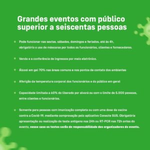 As regras para o funcionamento como de venda e conferências de ingressos, medidas de segurança contra a Covid-19 e ocupação são semelhantes as adotadas para casas noturnas, contudo, com capacidade limitada a 60% (sessenta por cento) do liberado por alvará ou com o limite de 5.000 (cinco mil) pessoas, entre clientes e funcionários.