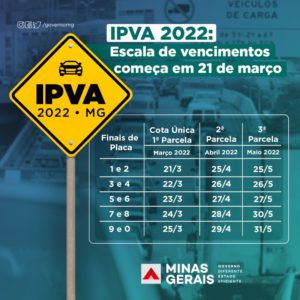 A escala de vencimentos do Imposto sobre a Propriedade de Veículos Automotores (IPVA) de 2022 em Minas Gerais terá início em 21/3. A medida tem o objetivo de desafogar o orçamento dos mineiros neste começo de ano.