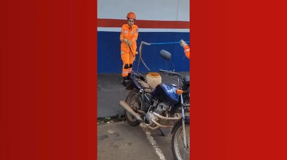 Segundo a ocorrência, quando chegaram ao endereço informado, a cobra havia saído do estabelecimento e entrado no banco de uma moto que estava estacionada do outro lado da rua.