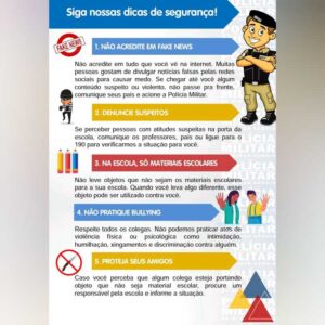 O material traz, entre outras dicas, alerta sobre notícias falsas que são compartilhadas nas redes sociais e como denunciar conteúdos relacionados a ataques às escolas ou pessoas em atitudes suspeitas, além de orientação sobre respeito aos colegas e professores e materiais que podem ser levados para unidades de ensino.