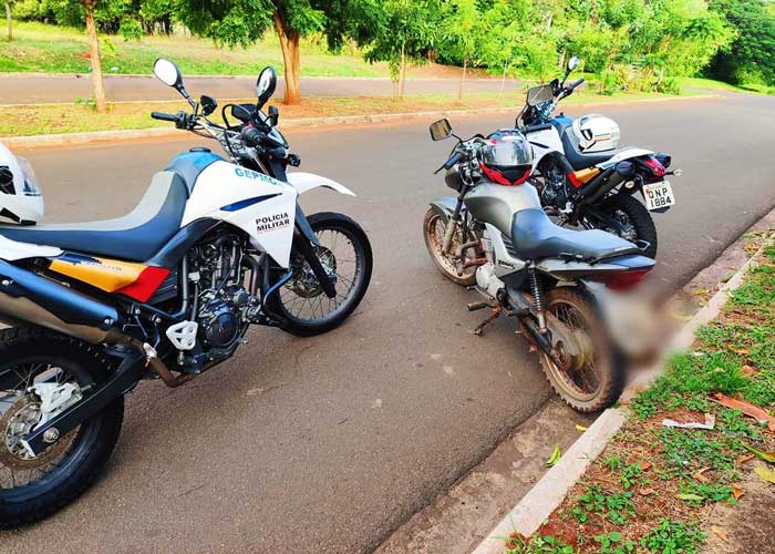 Durante o patrulhamento típico da Gepmor (Grupo Especializado de Patrulhamento Motorizado), os militares visualizaram uma motocicleta circulando pela rua G, no bairro Alcides Veríssimo. Foi realizada uma consulta e constatado que o último licenciamento do veículo foi em 2012.