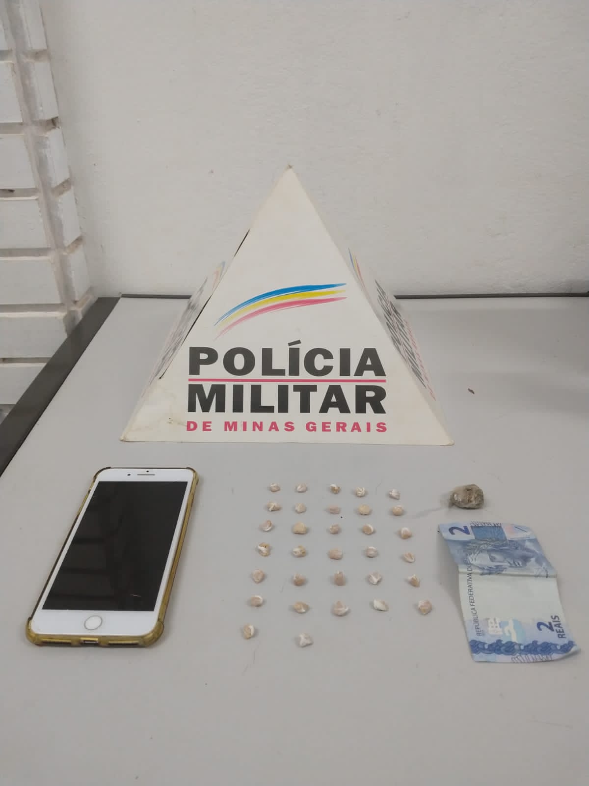 Foram apreendidas 32 (trinta e duas) pedras de substância análoga à crack embaladas em plástico branco, prontas para serem comercializadas; um tablete de maconha envolto por plástico transparente filme, pronto para ser comercializado; R$ 2,00 em espécie; e um telefone celular.