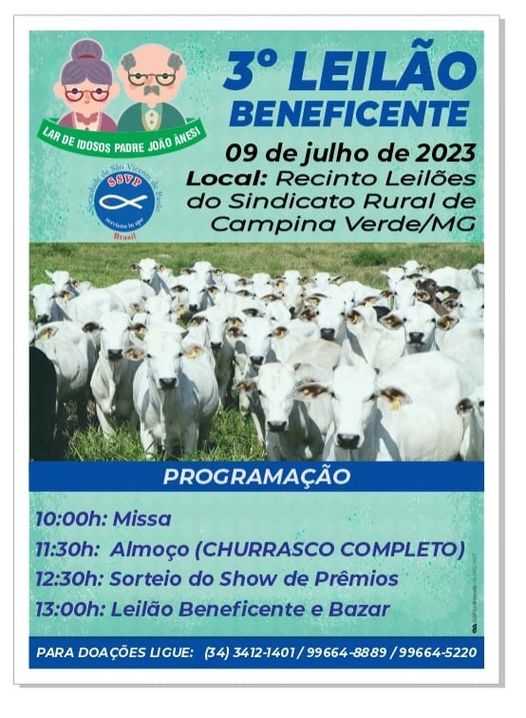 O Lar dos Idosos Padre João Ânesi vai realizar no dia 09 de julho, a partir das 13h o 3º Leilão Beneficente em prol ao lar. O evento acontece no recinto de leilões do Sindicato Rural de Campina Verde.