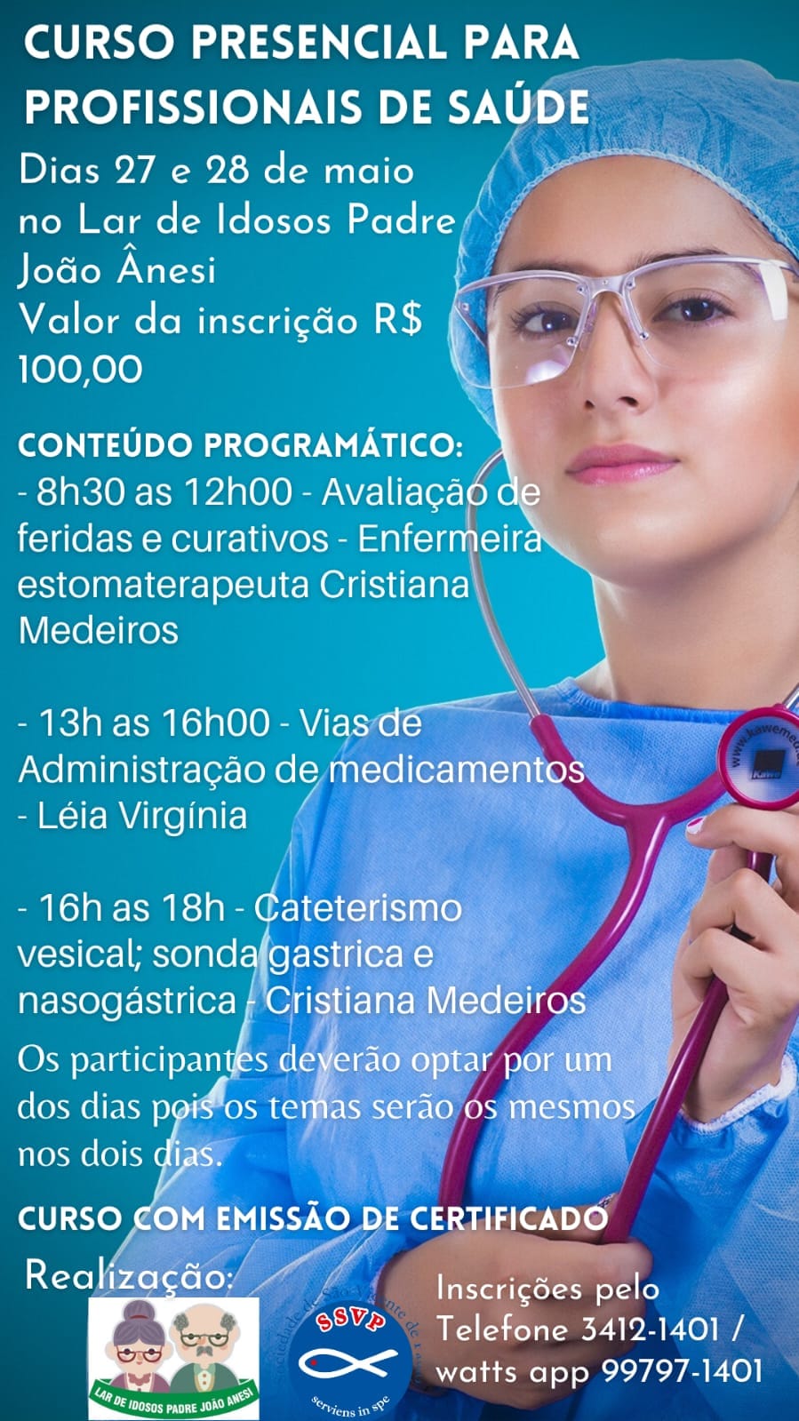 O Lar dos Idosos Padre João Ânesi estará promovendo nos dias 27 e 28/05, o curso presencial para os profissionais de saúde. O valor da inscrição é de R$ 100,00. Confira o conteúdo programático abaixo: