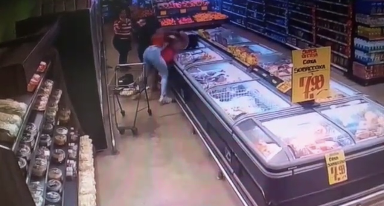 A vítima da agressão fazia compras, momento em que escolhia produtos em um dos refrigeradores da empresa, sendo surpreendida pela agressora, que entra no estabelecimento e inicia o ataque pelas costas. A mulher chega a cair dentro da geladeira e é retirada pela outra envolvida, que continua as agressões.