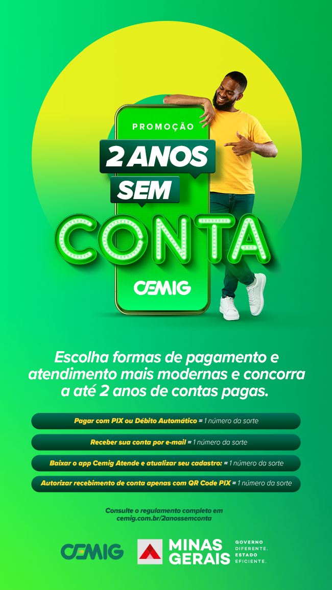 A Cemig lançou, em maio, a promoção “2 anos sem conta Cemig”. Trata-se de um incentivo para que o cliente possa aderir às formas digitais de pagamento e atendimento oferecidas pela companhia. Aderindo aos critérios estabelecidos no regulamento da promoção, o cliente concorre a até dois anos de faturas pagas e passa a utilizar as formas mais cômodas, modernas e seguras de quitação de contas e de atendimento. Para concorrer ao próximo sorteio, que será realizado em 24/6, os clientes podem se cadastrar até quinta-feira (15/6).