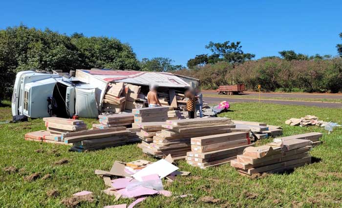 Um caminhão carregado com caixas de móveis tombou no local. O veículo transportava duas pessoas no momento do acidente.