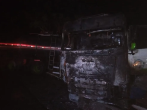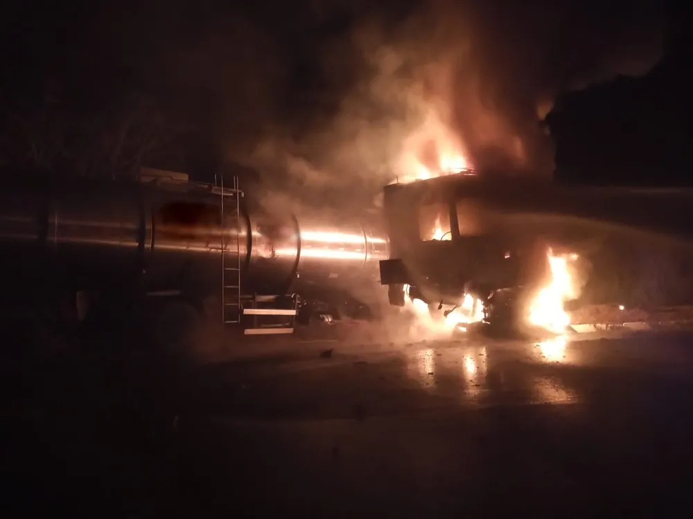 Um caminhão-tanque usado para transportar óleo vegetal bateu na grade de proteção de uma ponte e pegou fogo na noite de sábado (24) na BR-364, em Frutal. O veículo estava desabastecido no momento do acidente.