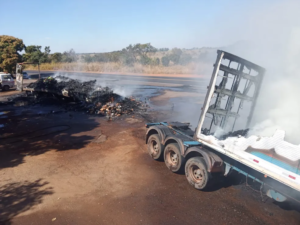 Um caminhão bitrem carregado com fitas adesivas ficou completamente destruído depois de pegar fogo na manhã desta terça-feira (4) na BR-153, em Frutal. O material transportado causou uma nuvem de fumaça preta.