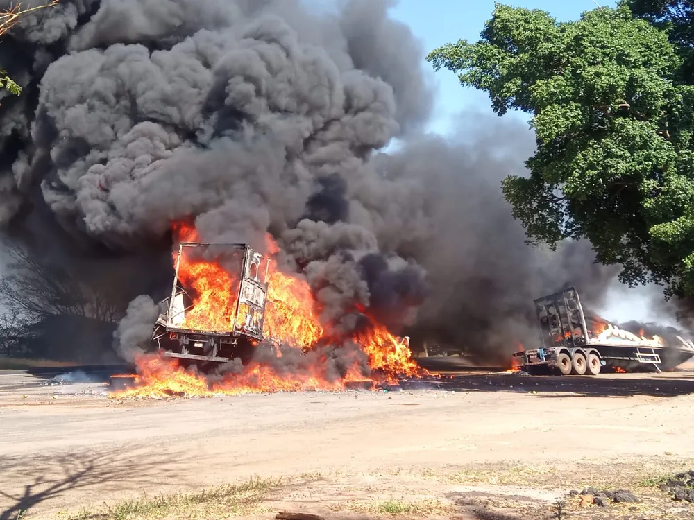 Frutal: Carreta bitrem pega fogo e causa nuvem de fumaça preta