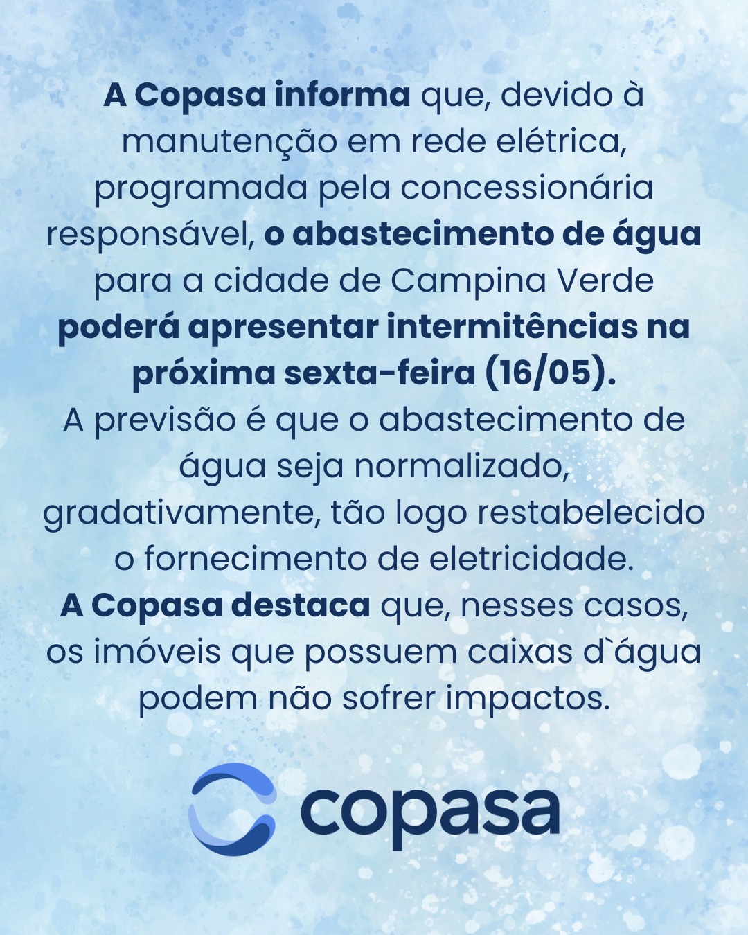 A Copasa informa a toda comunidade que devido a uma manutenção na rede elétrica programada pela concessionária responsável, o abastecimento de água em Campina Verde poderá apresentar intermitências na próxima sexta-feira 16/05. A previsão é que o abastecimento de água seja normalizado gratadivamente.
