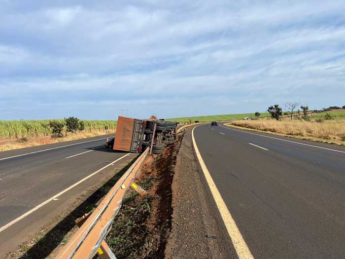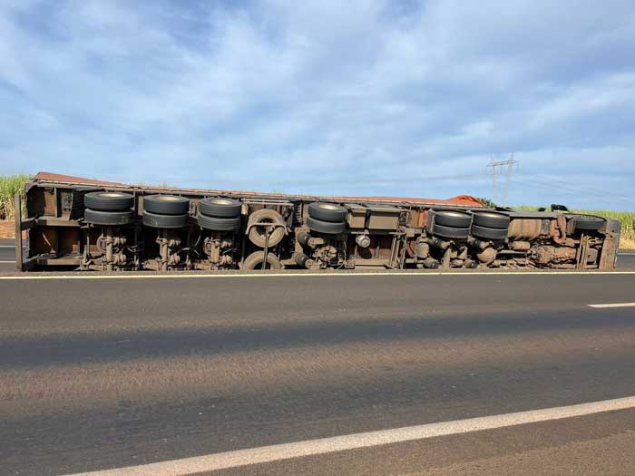Já nesta segunda-feira (23), por volta das 13h, foi realizada a interdição total da pista leste, no km 909, nas proximidades do entroncamento com a BR-153, para a retirada da carreta tombada. Durante o procedimento, o tráfego de veículos está sendo desviado para uma estrada vicinal.