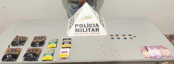 Durante a abordagem, o indivíduo confessou a autoria do furto. Em busca pessoal, os policiais encontraram em seus bolsos 34 pedras de crack, R$ 22,70 em dinheiro, além dos materiais furtados, sendo quatro cigarros da marca Diplomata, dois maços de palheiro e um maço de cigarro comum.