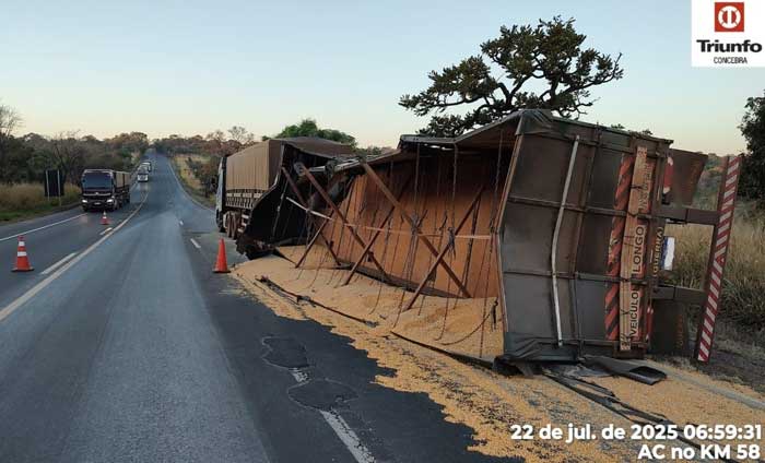 Na madrugada desta terça-feira (22), por volta de 1h14, um acidente envolvendo duas carretas seguido do tombamento de uma delas causou a interdição total da BR-153, no km 58, em Monte Alegre de Minas (MG).