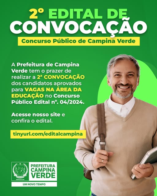A Prefeitura Municipal de Campina Verde divulga a 2ª convocação para os candidatos aprovados no Concurso Público para a área da Educação (Edital Nº 04/2024.