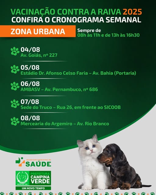 🚨 A prefeitura de Campina Verde por meio do departamento de endemias informa a todos os tutores de cães e gatos, que a campanha de vacinação cotnra a raiva começou nessa segunda-feira na cidade. Confira os locais de atendimento:
