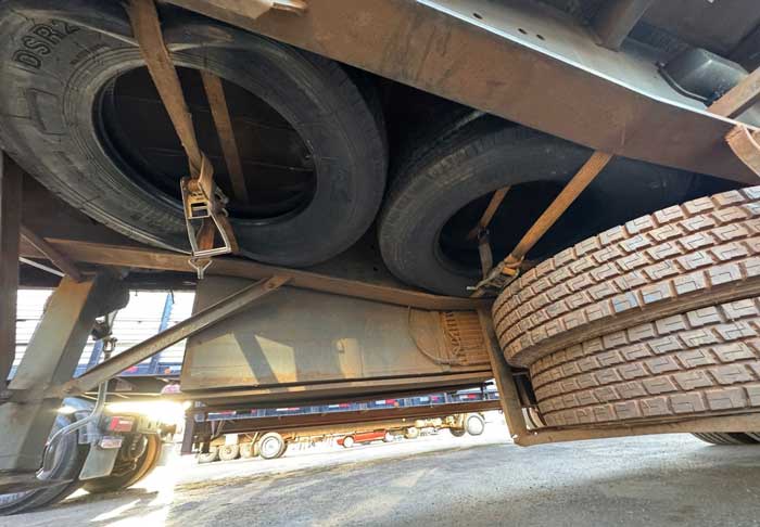 Durante operação de fiscalização, os militares abordaram um veículo de carga oriundo do Paraguai e carregado com arroz. Durante a vistoria, foram localizados sete pneus escondidos sob o semirreboque, amarrados de maneira oculta e sem documentação fiscal que comprovasse a origem legal dos itens.