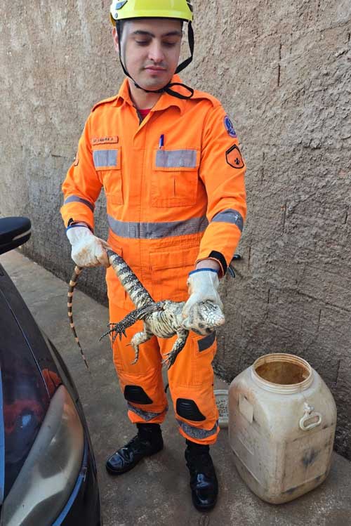 Na manhã de quarta-feira (13), por volta das 7h, o 2º Pelotão do Corpo de Bombeiros Militar de Ituiutaba foi acionado para resgatar um lagarto da espécie teiú no bairro Residencial Portal dos Ipês.