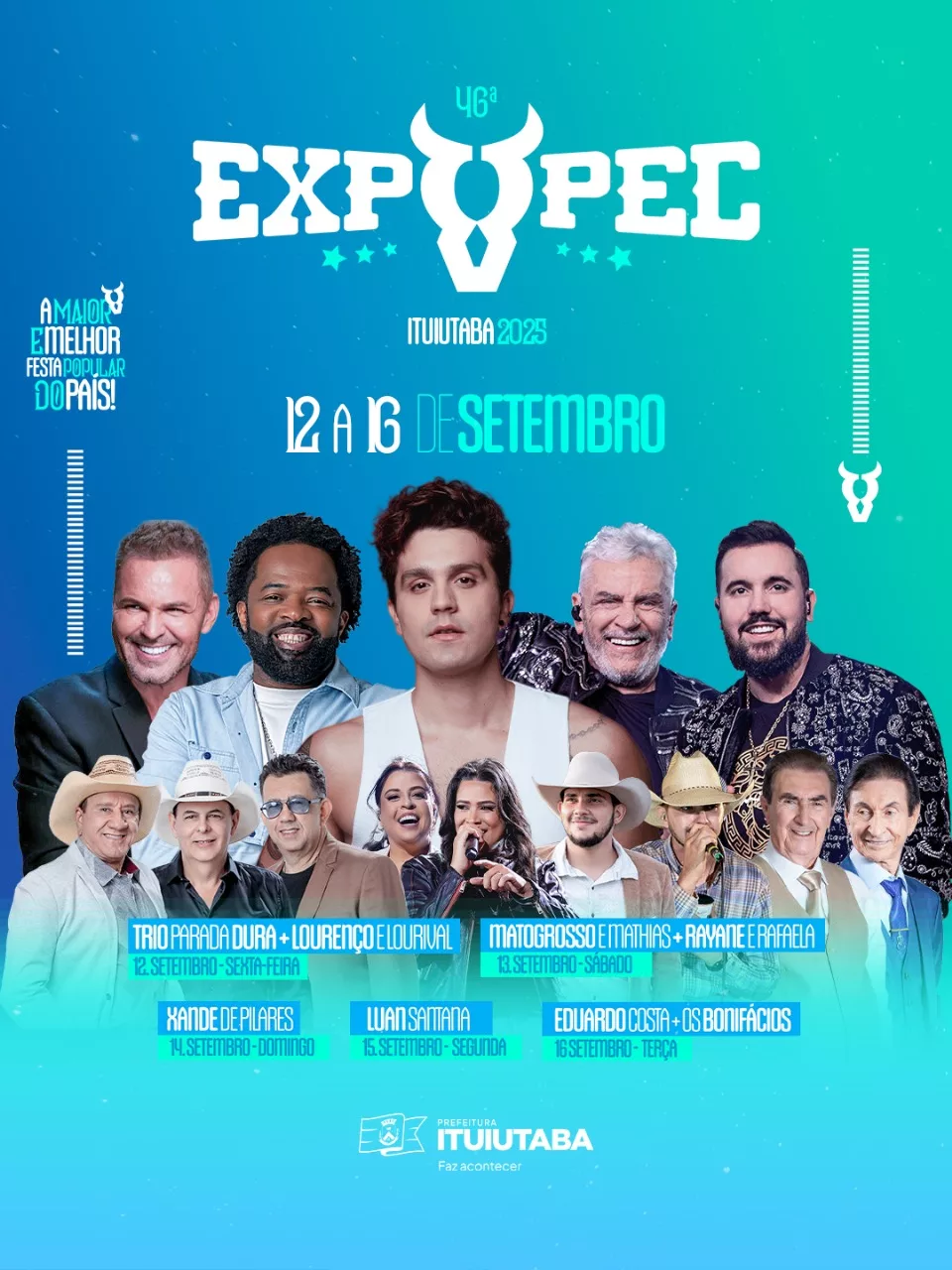 A programação musical promete atrair públicos variados. Na sexta-feira, 12 de setembro, os veteranos Lourenço & Lourival dividem o palco com o Trio Parada Dura, ícones da música sertaneja raiz. No sábado, 13, a nova geração do sertanejo feminino, representada por Rayane & Rafaela, antecede o show da dupla Matogrosso & Mathias. No domingo, 14, é a vez de Xande de Pilares comandar a festa, levando o samba para o Parque de Exposições. Na segunda, 15, a atração principal será Luan Santana. O encerramento acontece na terça, 16, com apresentações de João de Souza & Bonifácio e Eduardo Costa.
