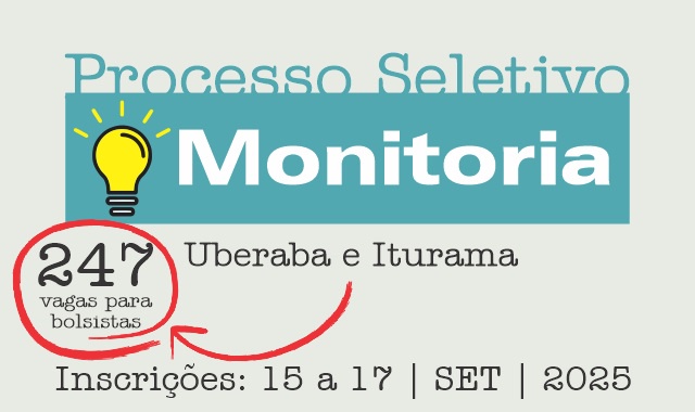 O Campus Universitário de Iturama da Universidade Federal do Triângulo Mineiro (UFTM) abrirá, entre os dias 15 e 17 de setembro, as inscrições para o Processo Seletivo de Monitoria dos cursos de Graduação 2025/02. A seleção oferece 247 bolsas de monitoria, além de vagas para atuação como monitores voluntários.