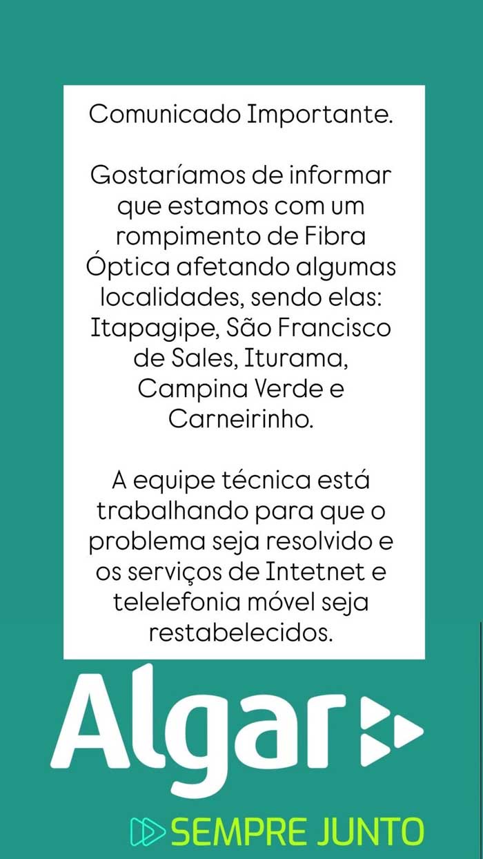 Na manhã desta terça-feira (2), um rompimento no backbone de fibra ótica da Algar Telecom provocou a queda de internet em várias cidades da região, incluindo Iturama, Carneirinho, Campina Verde, São Francisco de Sales e Itapagipe.