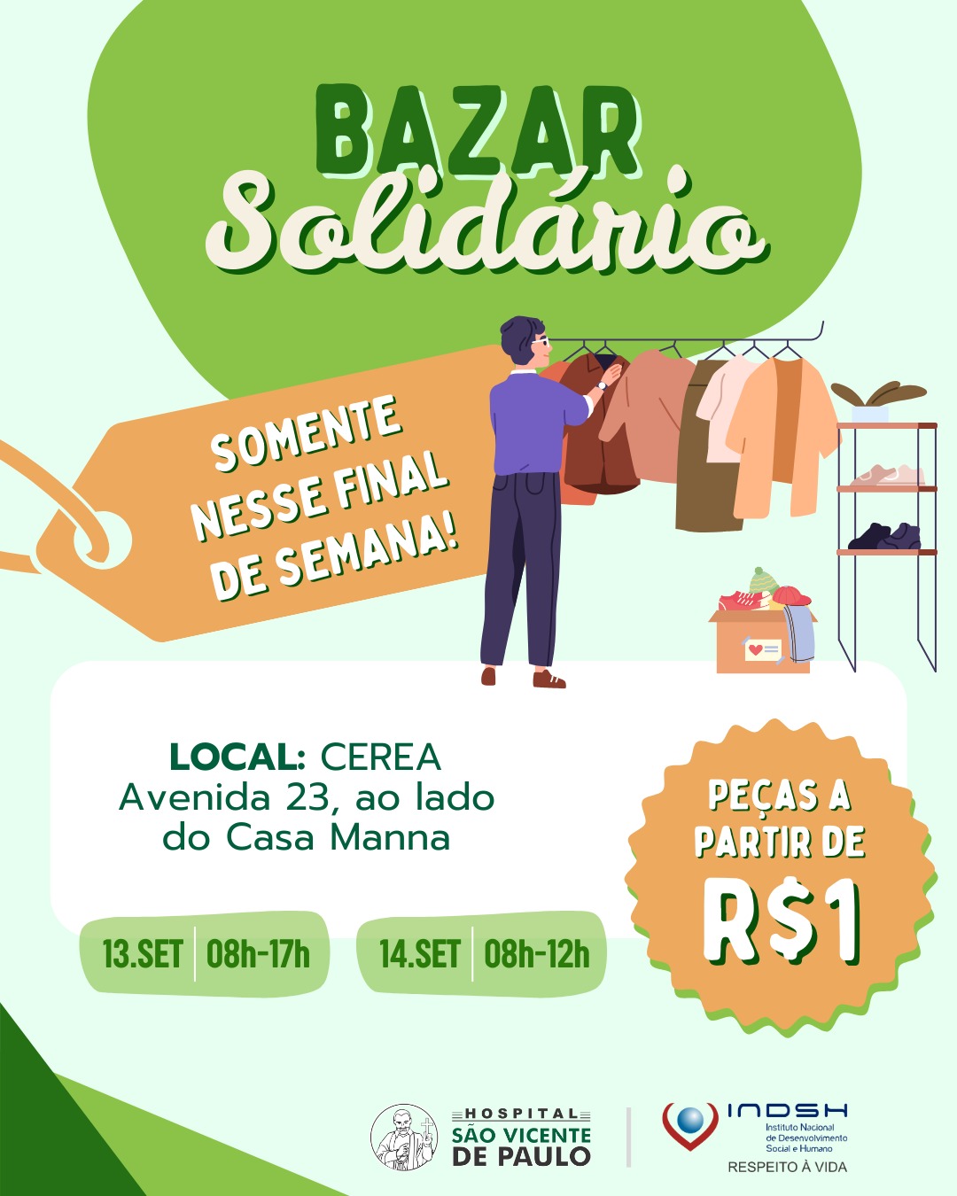 📢 A direção do Hospital São Vicente de Paulo informa a toda comunidade que estará realizando nos dias 13 e 14 de setembro o Bazar Solidário em prol ao hosptial com roupas, calçados e acessórios com preços incríveis, a partir de R$ 1,00. 👗👞