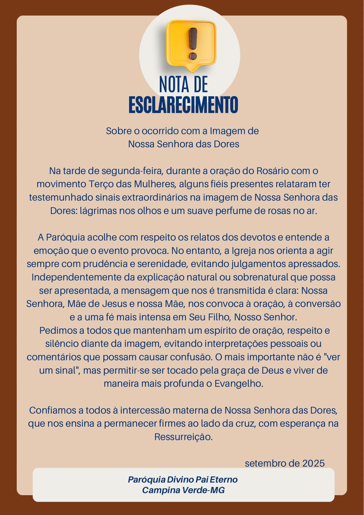A direção da Paróquia Divino Pai Eterno publicou uma nota de esclarecimento sobre o fato ocorrido alegando que a igreja orienta sempre a agir com prudência e serenidade, evitando julgamentos apressados.
