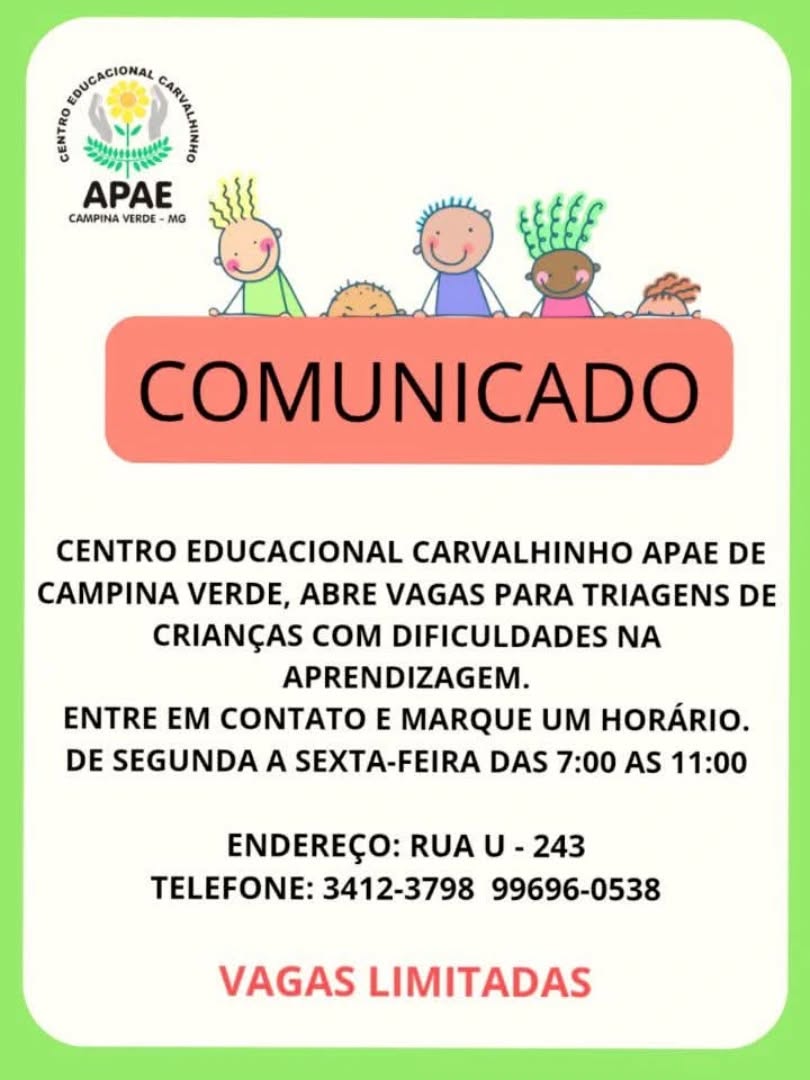 O Centro Educacional Carvalhinho APAE de Campina Verde, informa quer está com vaga para crianças com dificuldades na aprendizagem. Os interessados entrar em contato e marcar horário de segunda a sexta-feira das 07h às 11h. Mais informações na APAE que fica na Rua U, Nº 243 ou pelos telefones 3412-3798 ou 9 9696-0538.