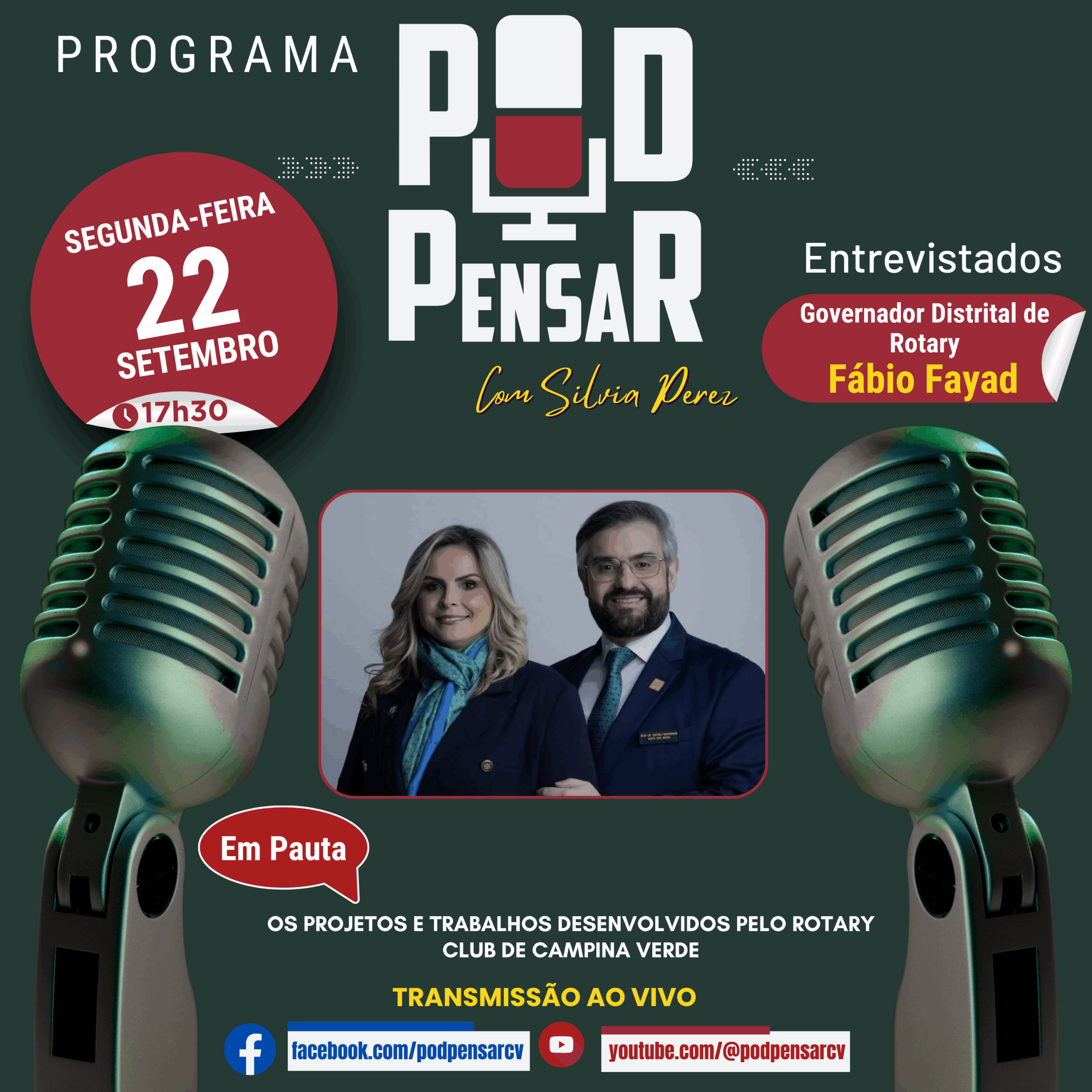 🗓 Receberemos o Governador Distrital do Rotary, Fábio Fayad, para uma entrevista imperdível, onde vamos conhecer os projetos e trabalhos desenvolvidos pelo Rotary Club de Campina Verde.