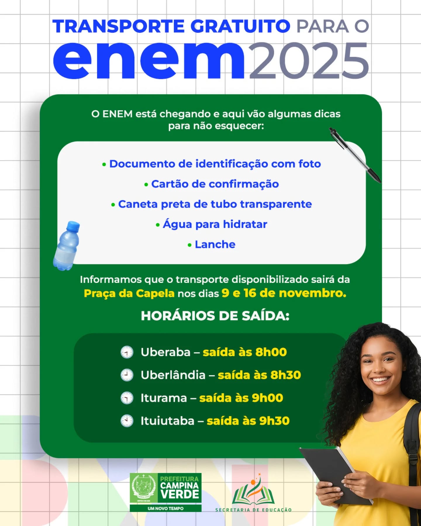 A prefeitura de Campina Verde informa aos estudantes que vão fazer a prova do ENEM 2025 que vai conceder o transporte gratuito para para as cidades de Uberaba, Uberlândia, Iturama e Ituiutaba. Fique atento às dicas para não esquecer nada no dia da prova: Documentos necessários: