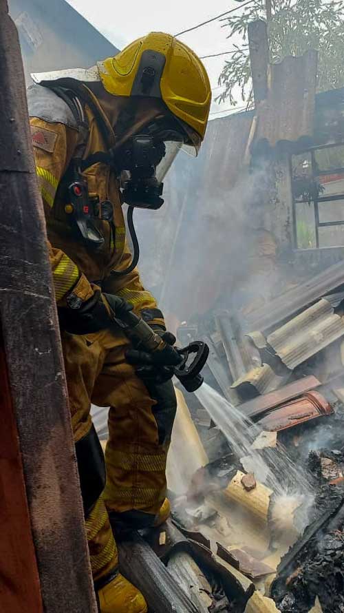 Com o fogo controlado, a equipe realizou escoramentos preventivos para garantir segurança durante o rescaldo e o resfriamento do ambiente, procedimentos essenciais para eliminar focos remanescentes e prevenir a reignição.