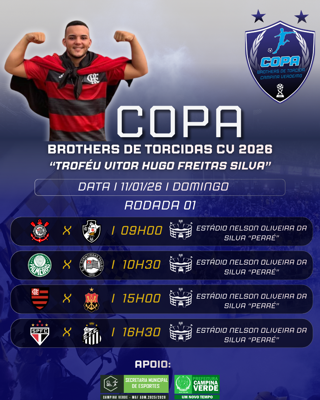 O esporte vai tomar conta de Campina Verde neste domingo, 11 de janeiro de 2026, com o início da Copa Brothers de Torcida CV Troféu Vitor Hugo Freitas Silva 2026, no Estádio Nelson Oliveira da Silva “PERRE”.